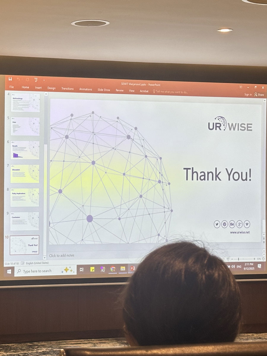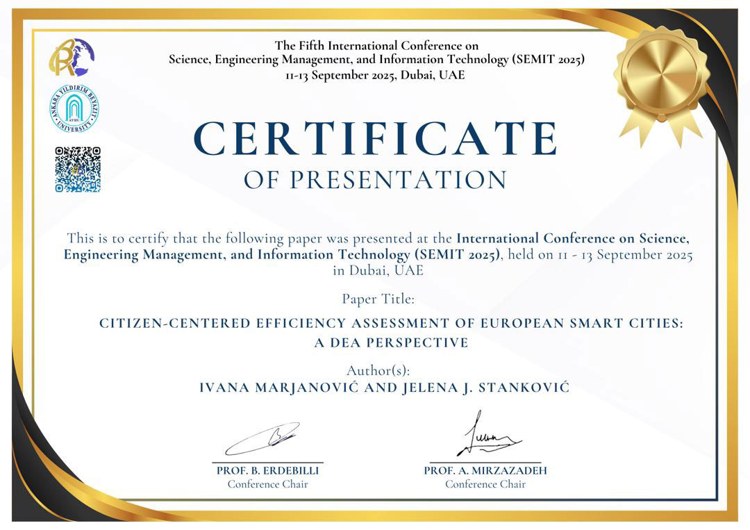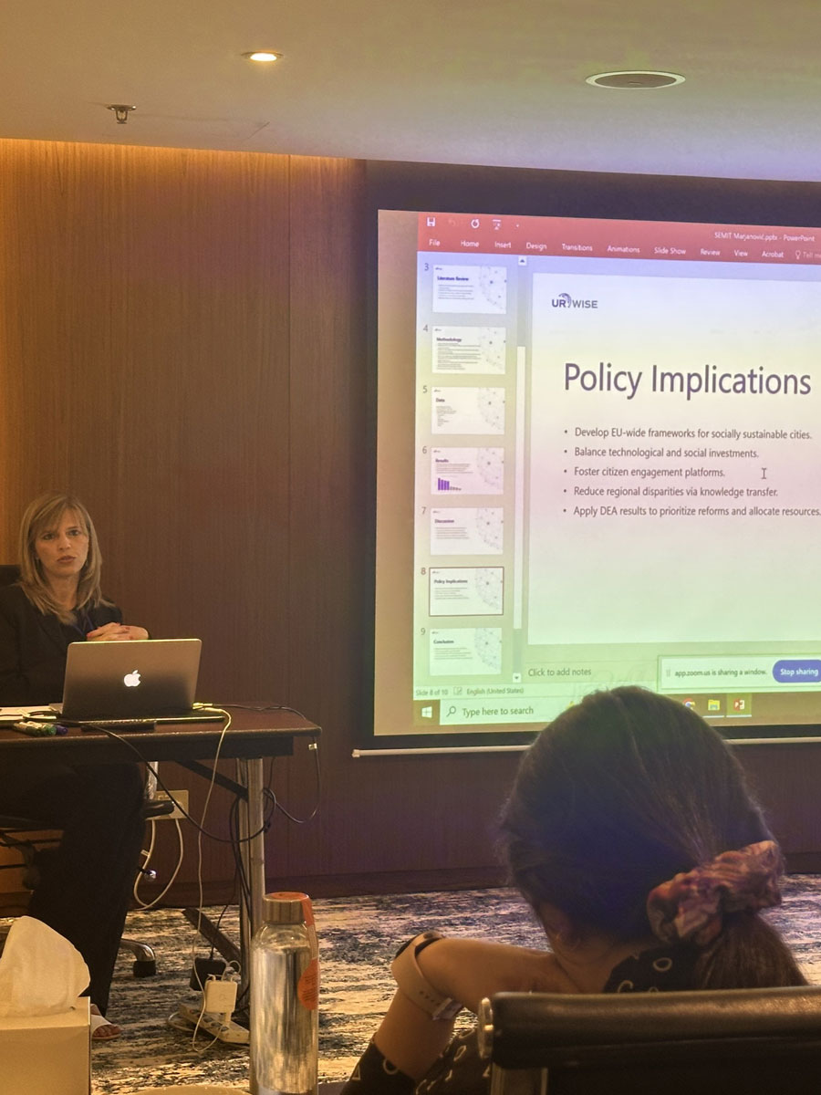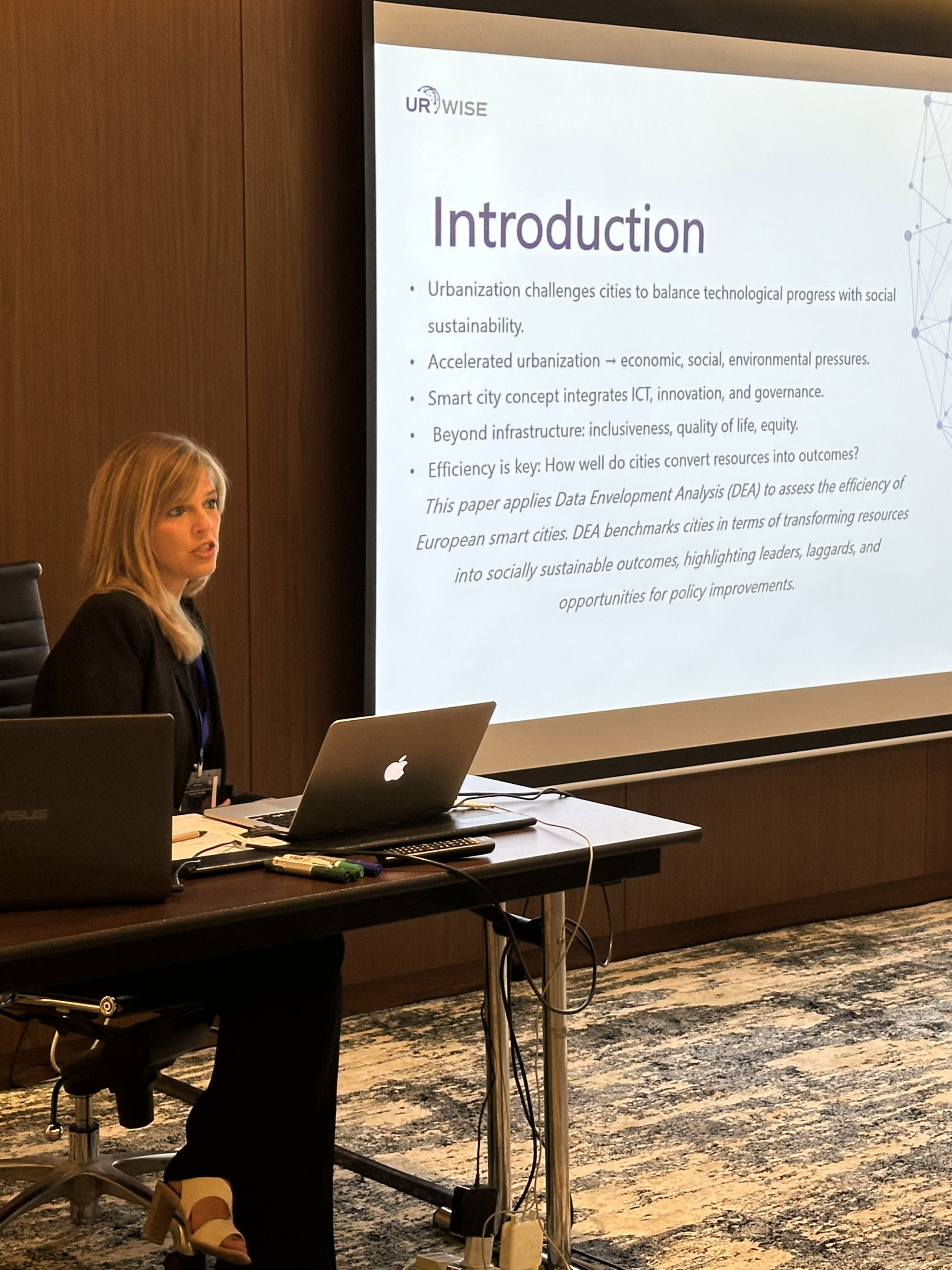 Ivana Marjanović and Jelena Stanković presented their research titled “Citizen-Centered Efficiency Assessment of European Smart Cities: A DEA Perspective”within the thematic session “Machine Learning and Information Technology in Advancing Health, Business, and Environment.” Their presentation offered a data-driven approach to evaluating smart city performance by integrating citizen-centered metrics with Data Envelopment Analysis (DEA), a perspective highly aligned with UR-WISE’s commitment to advancing analytical tools for resilient urban and regional development.
